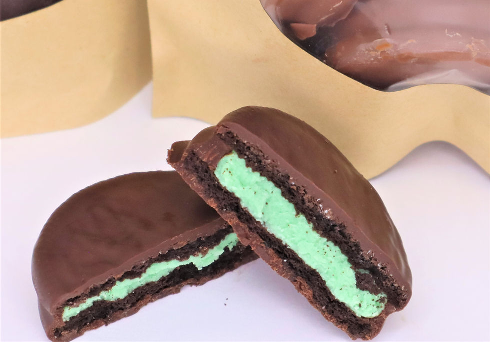Milk or Dark Chocolate Covered Mint Cream Filled Sandwich Cookies